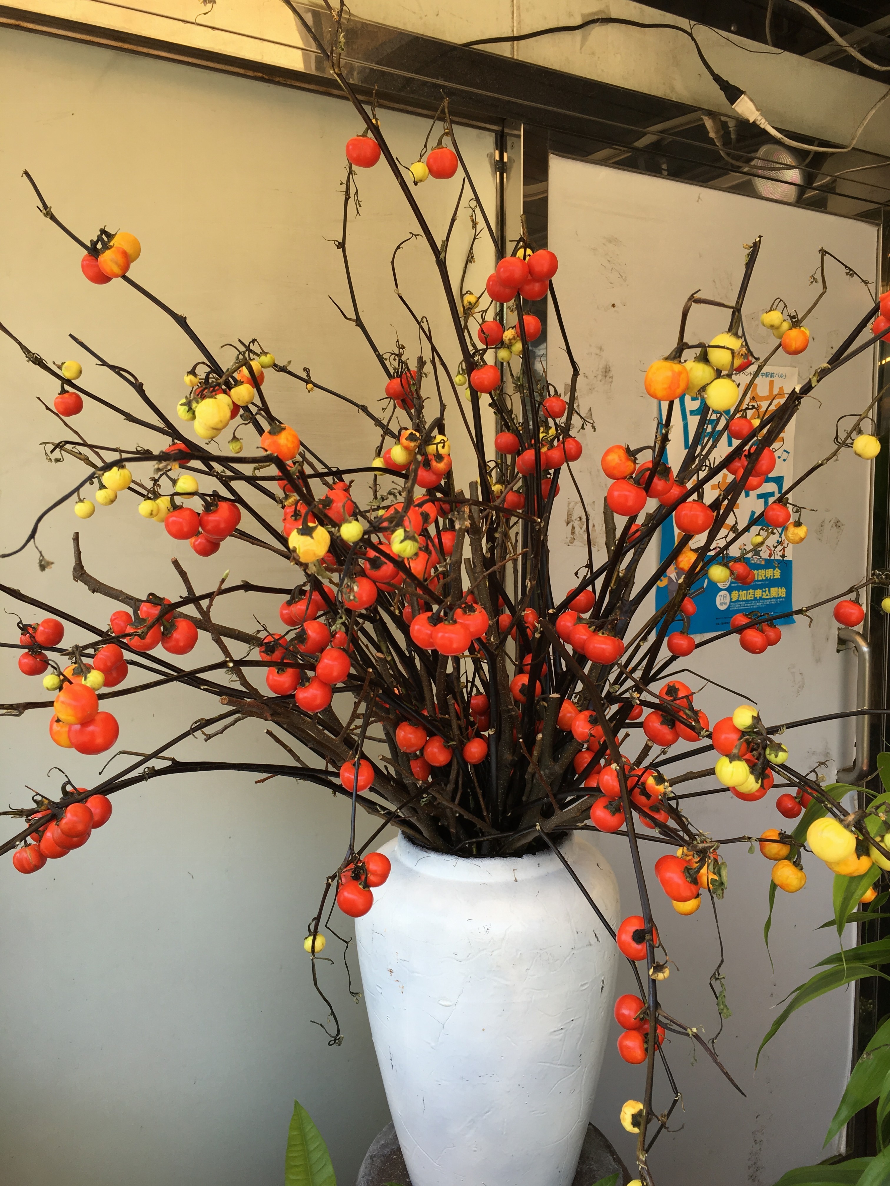 恒例、店頭のツボ活けが、「花ナス」に変わりました。気分だけでも秋に♬