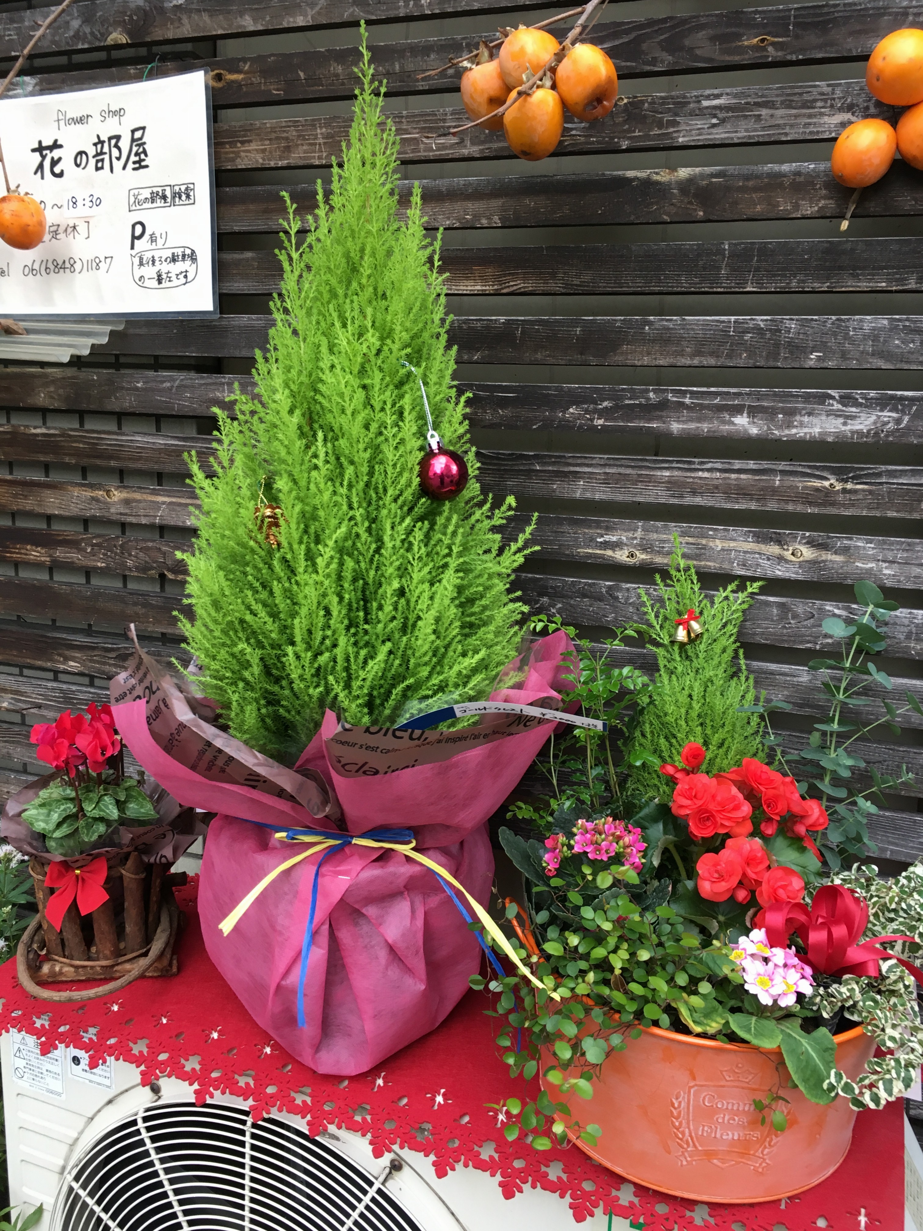 冬の定番、ゴールドクレスト(緑の木。寒くなると緑が黄金色になることから、「ゴールド」)